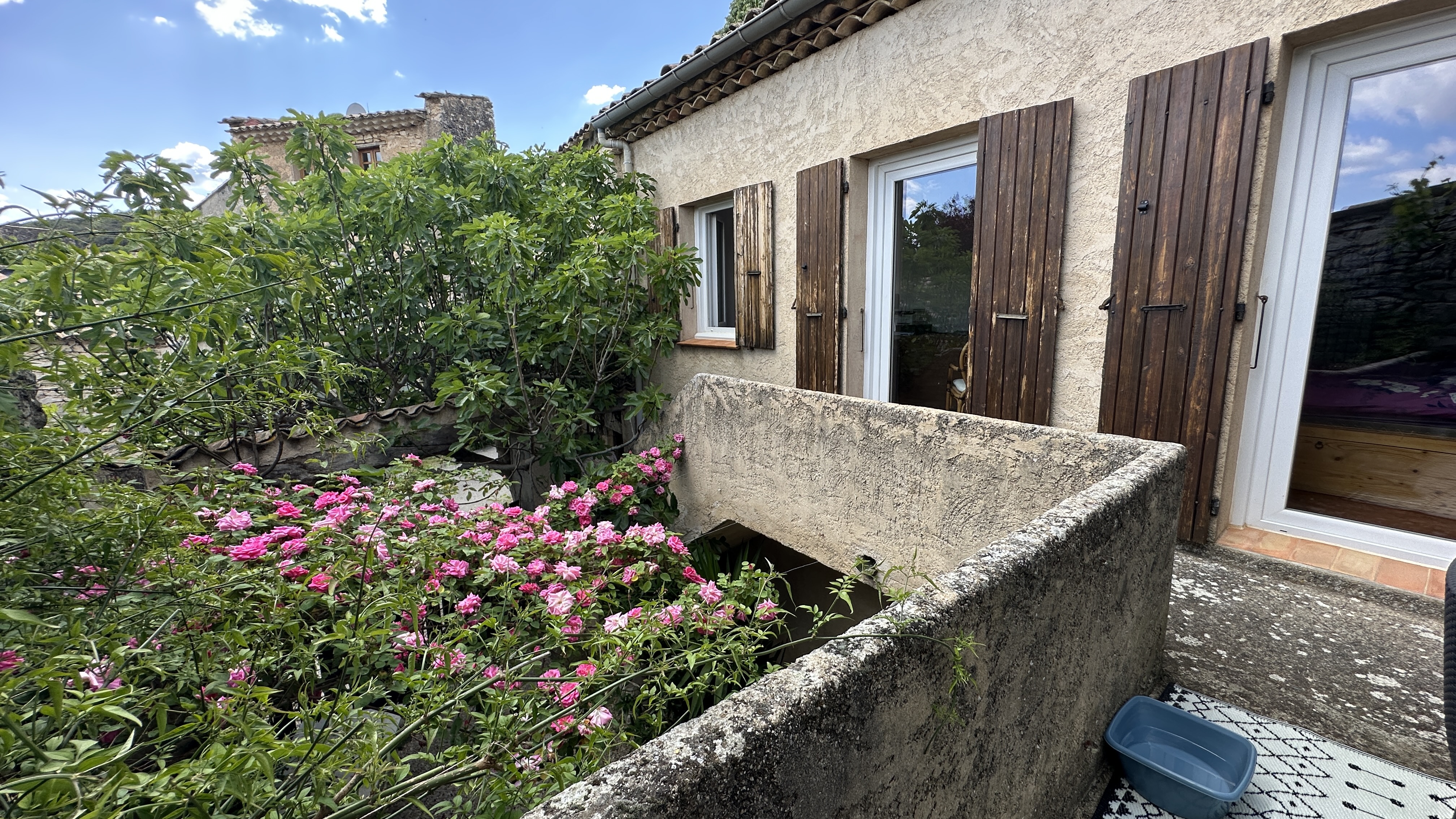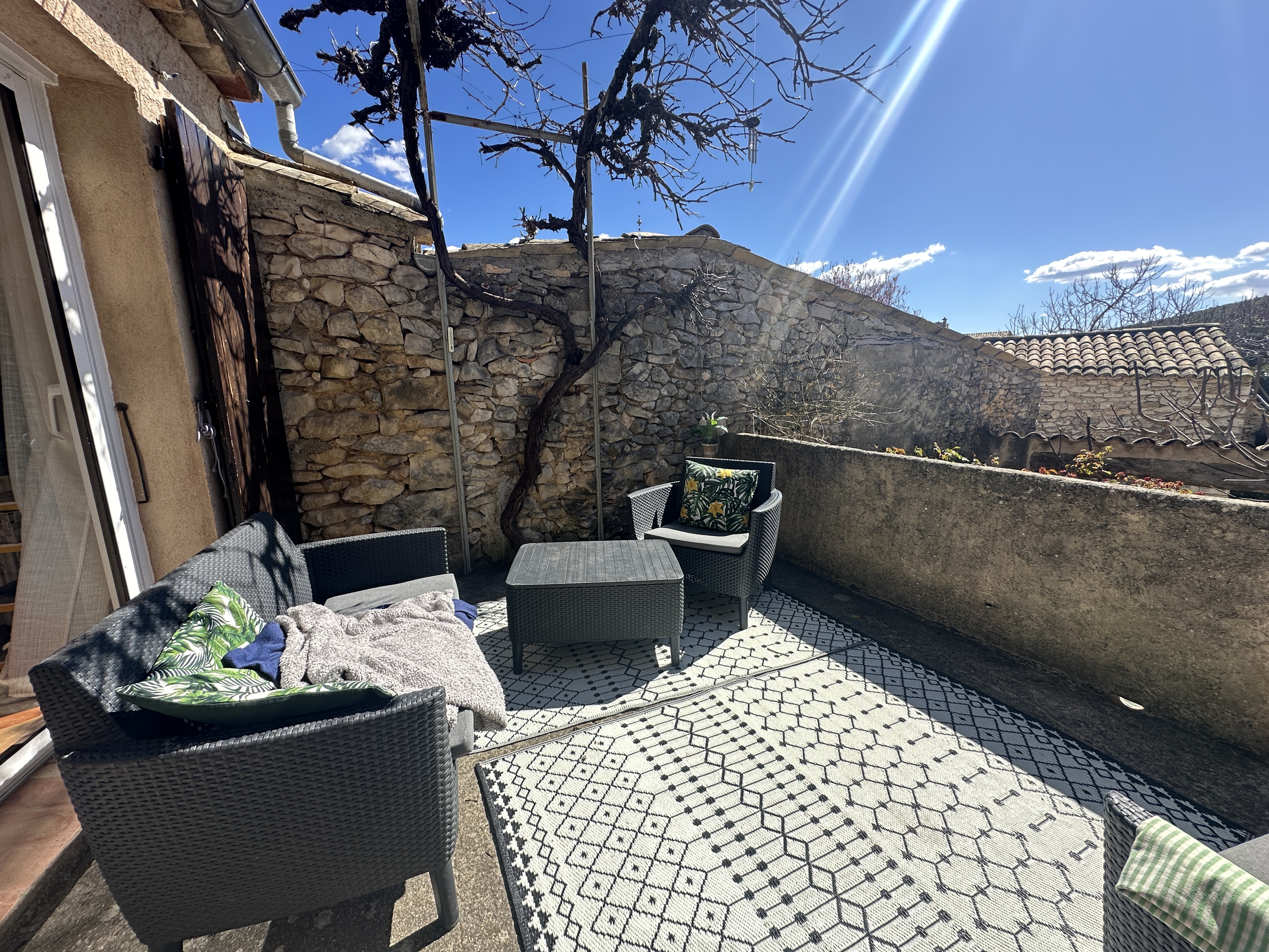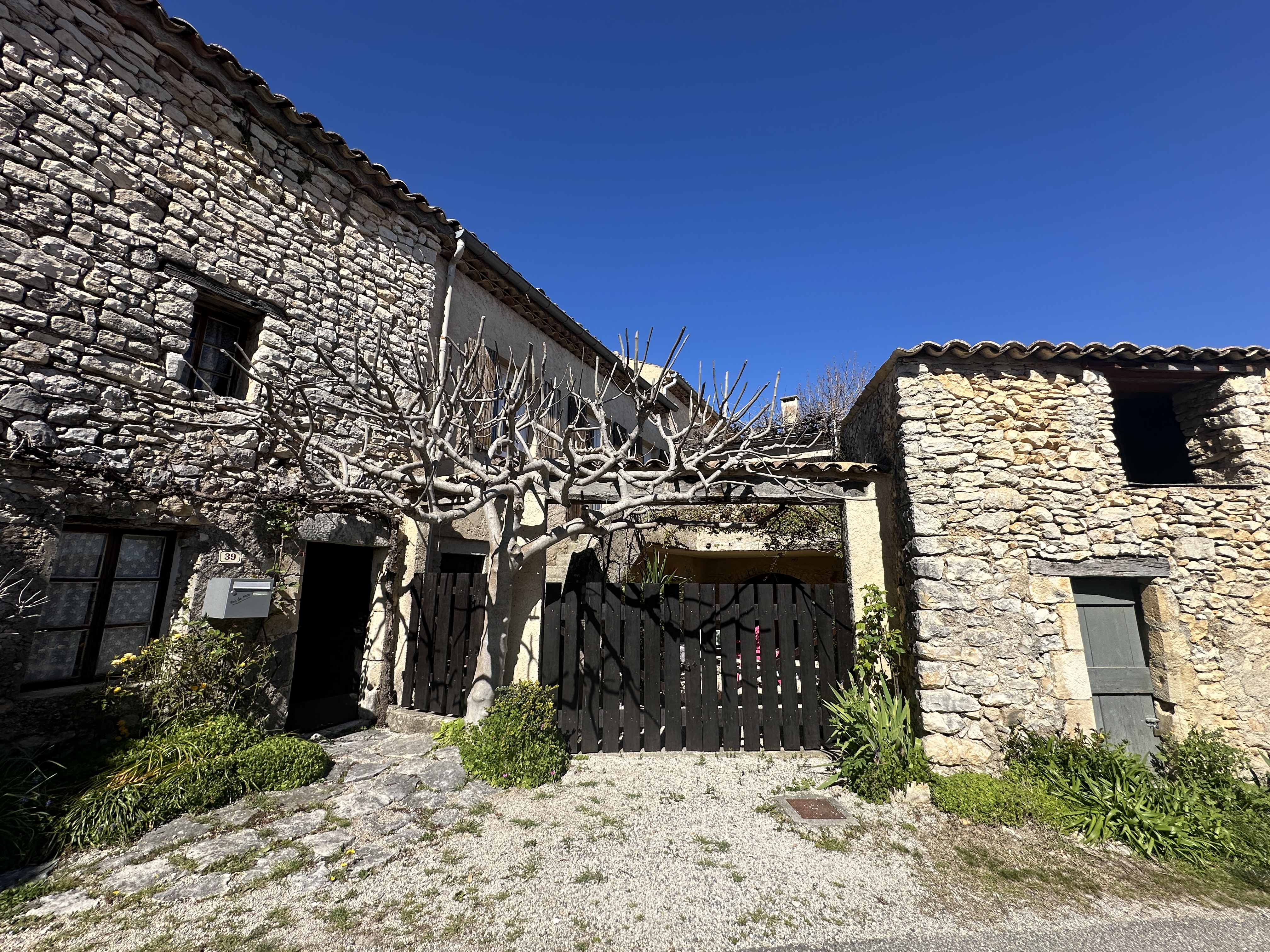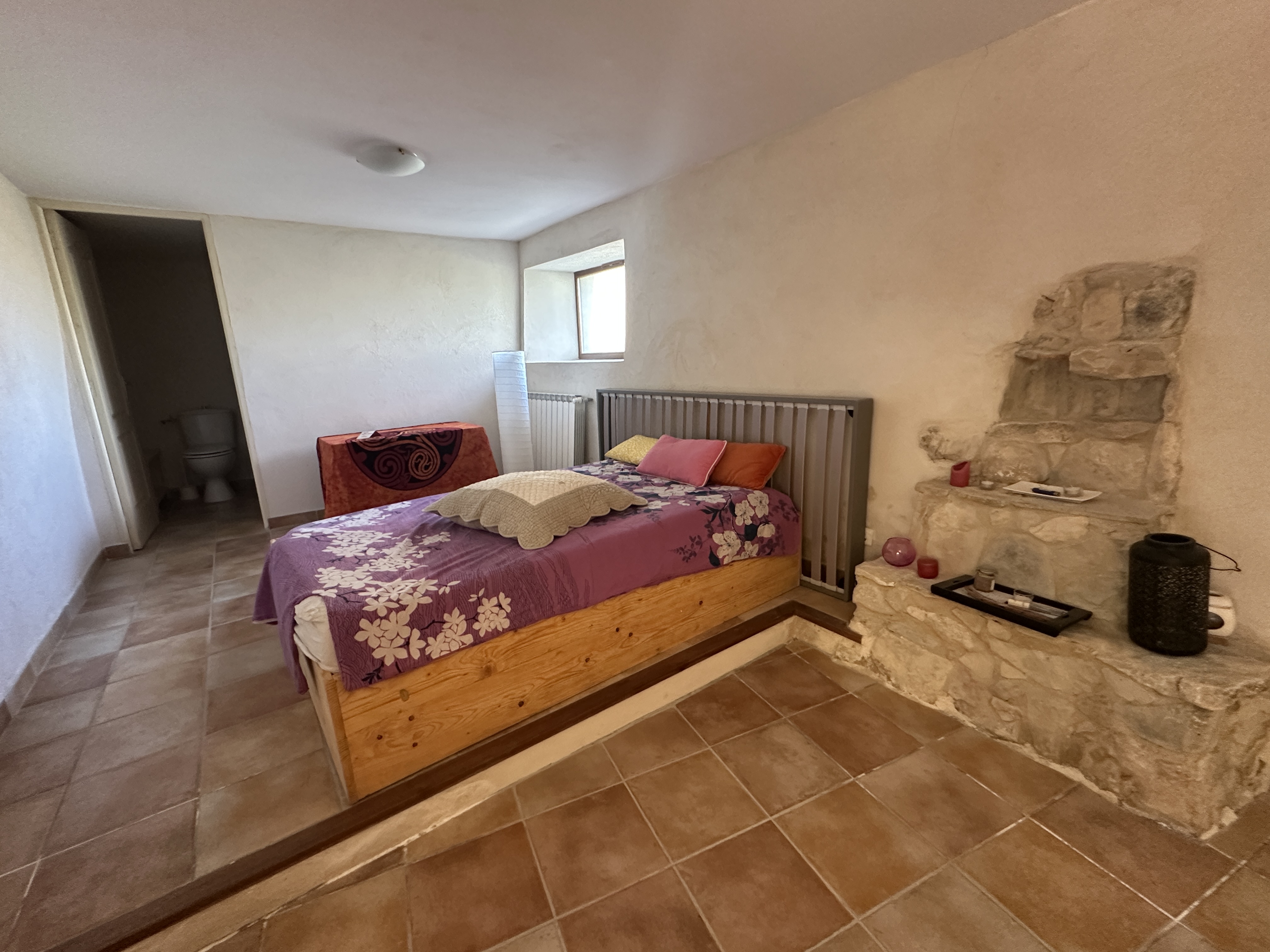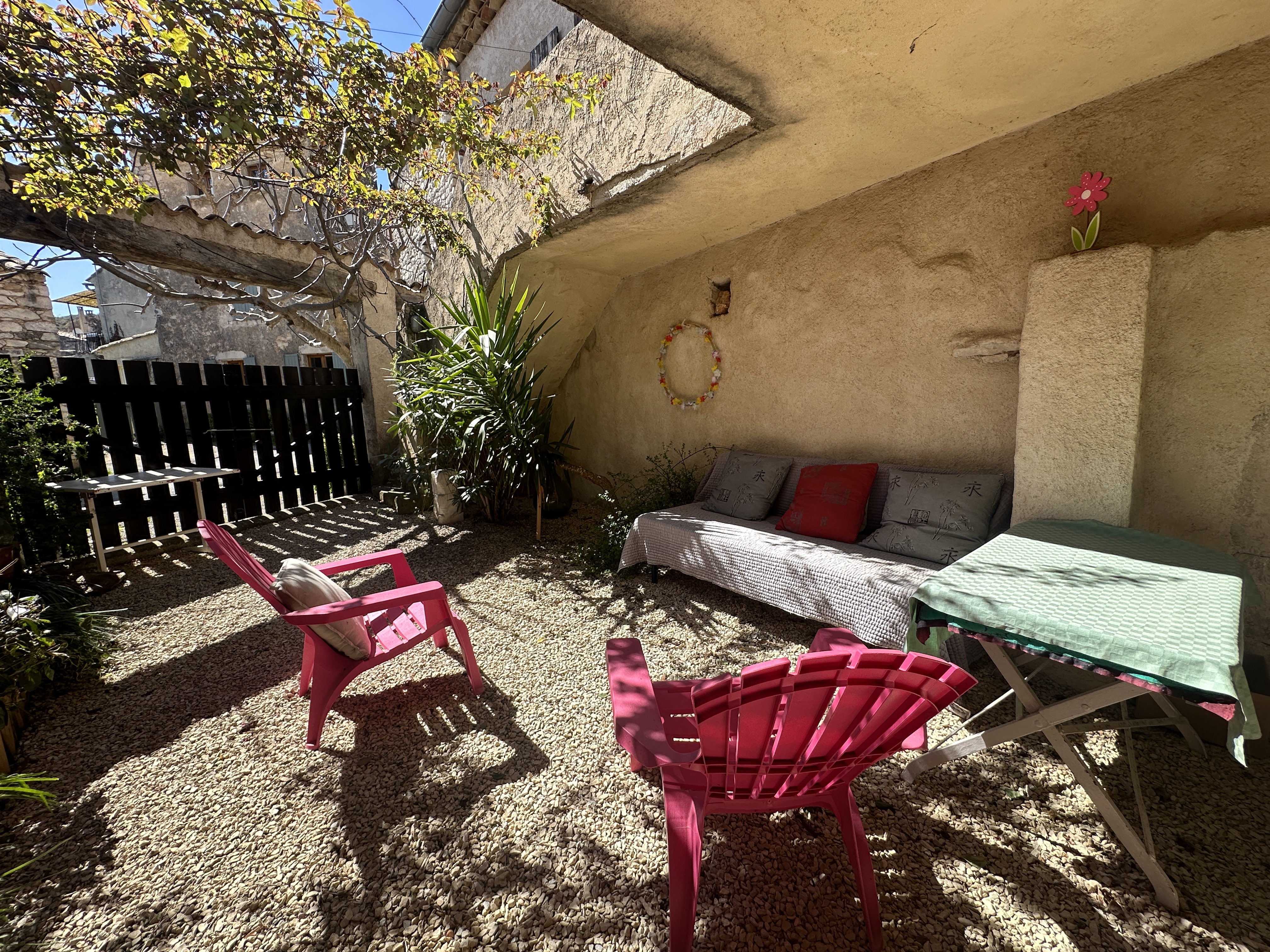Dotée d’une terrasse plein sud et d’une cour fleurie et aménagée, cette maison de 138 m2 offre un cadre bucolique et tranquille avec ses deux chambres, son salon avec cheminée, une salle de séjour avec coin cuisine à aménager, une salle de bain et des WC séparés, ainsi qu’un figuier et une vigne donnant du raisin en abondance.