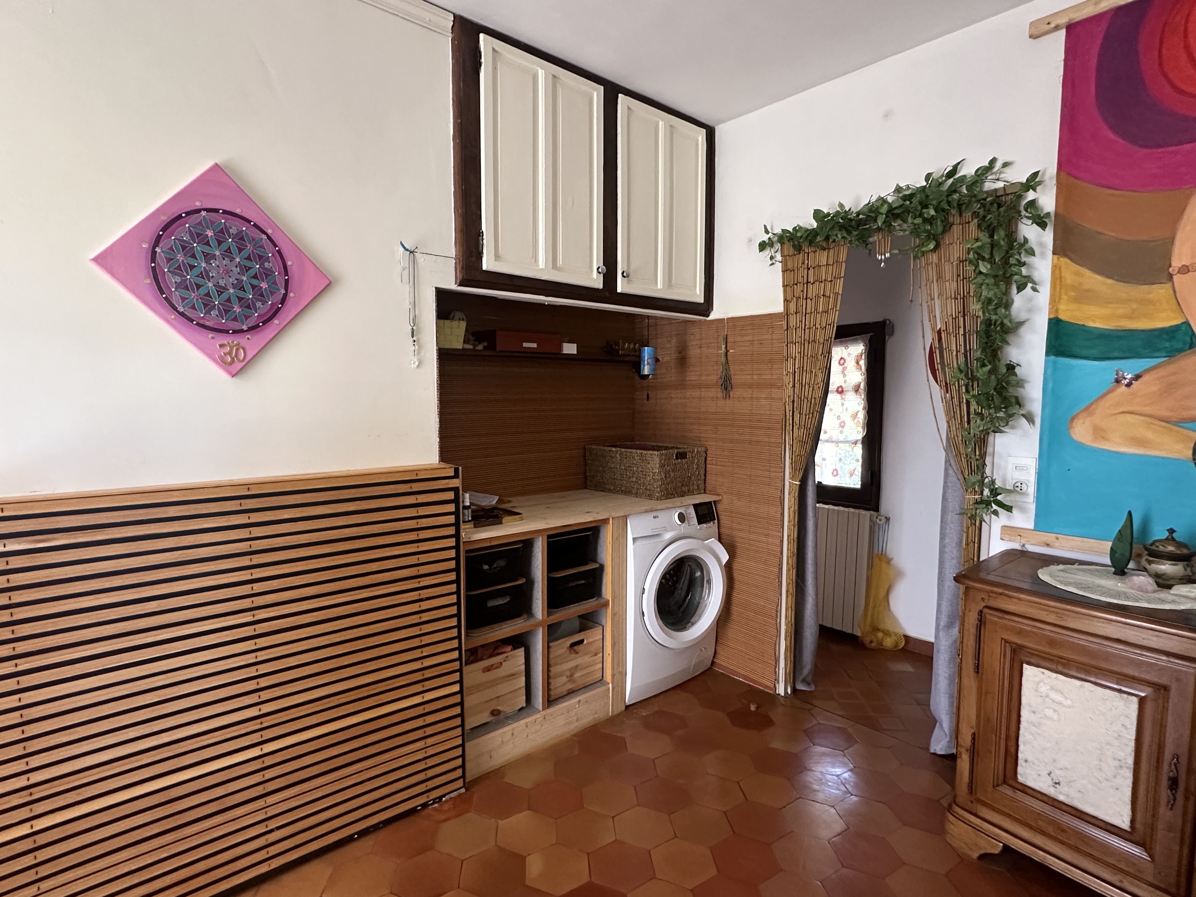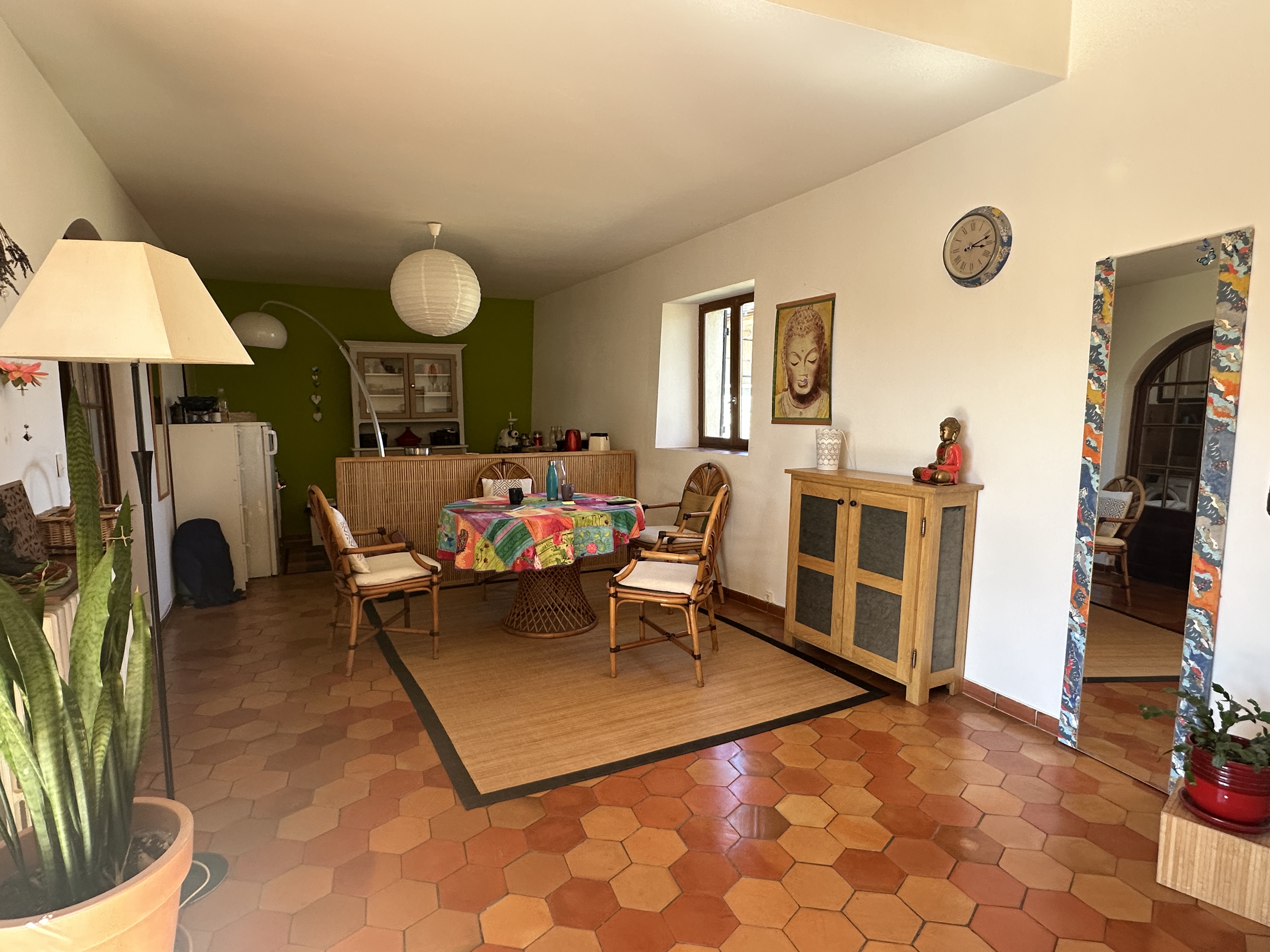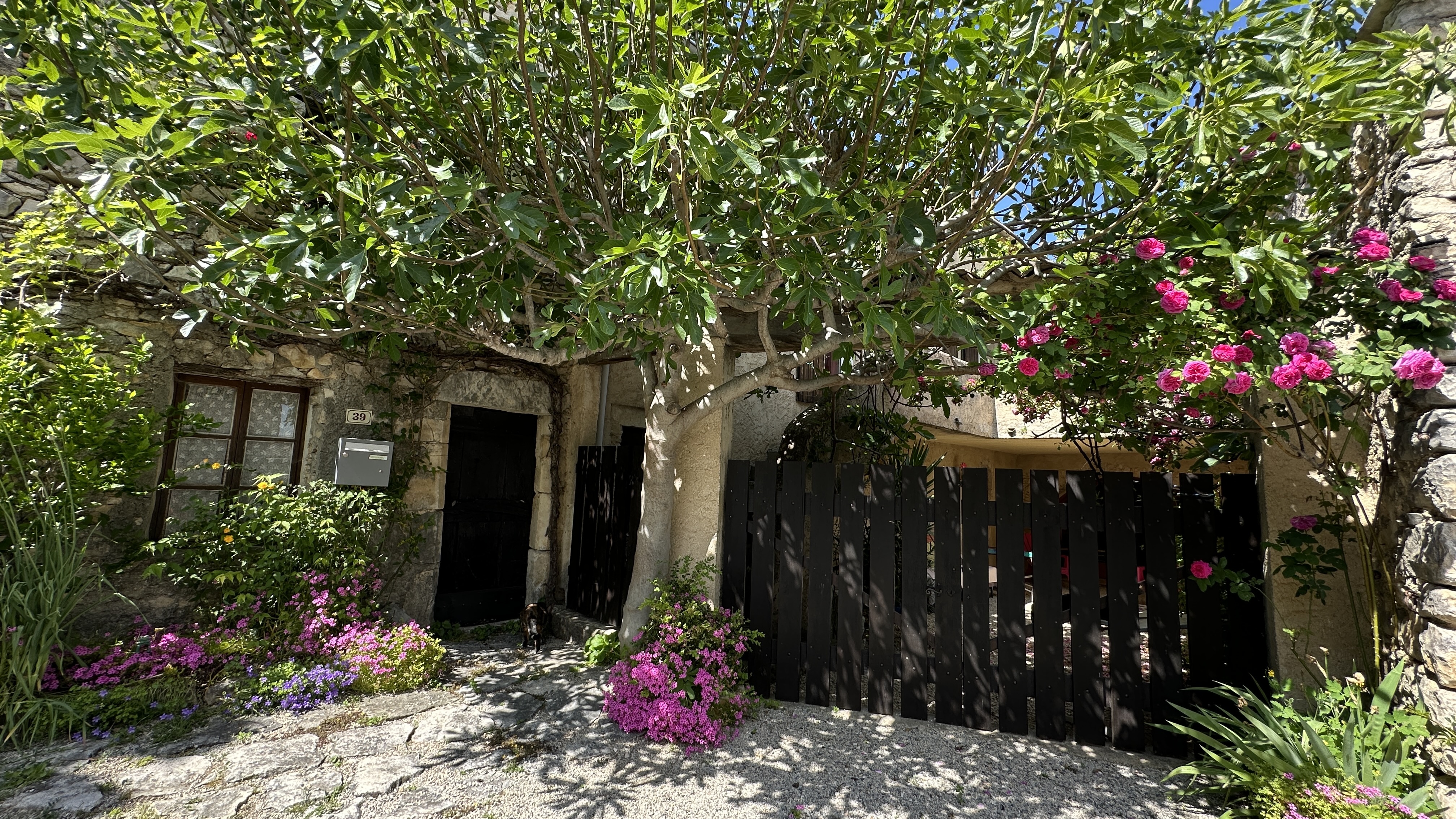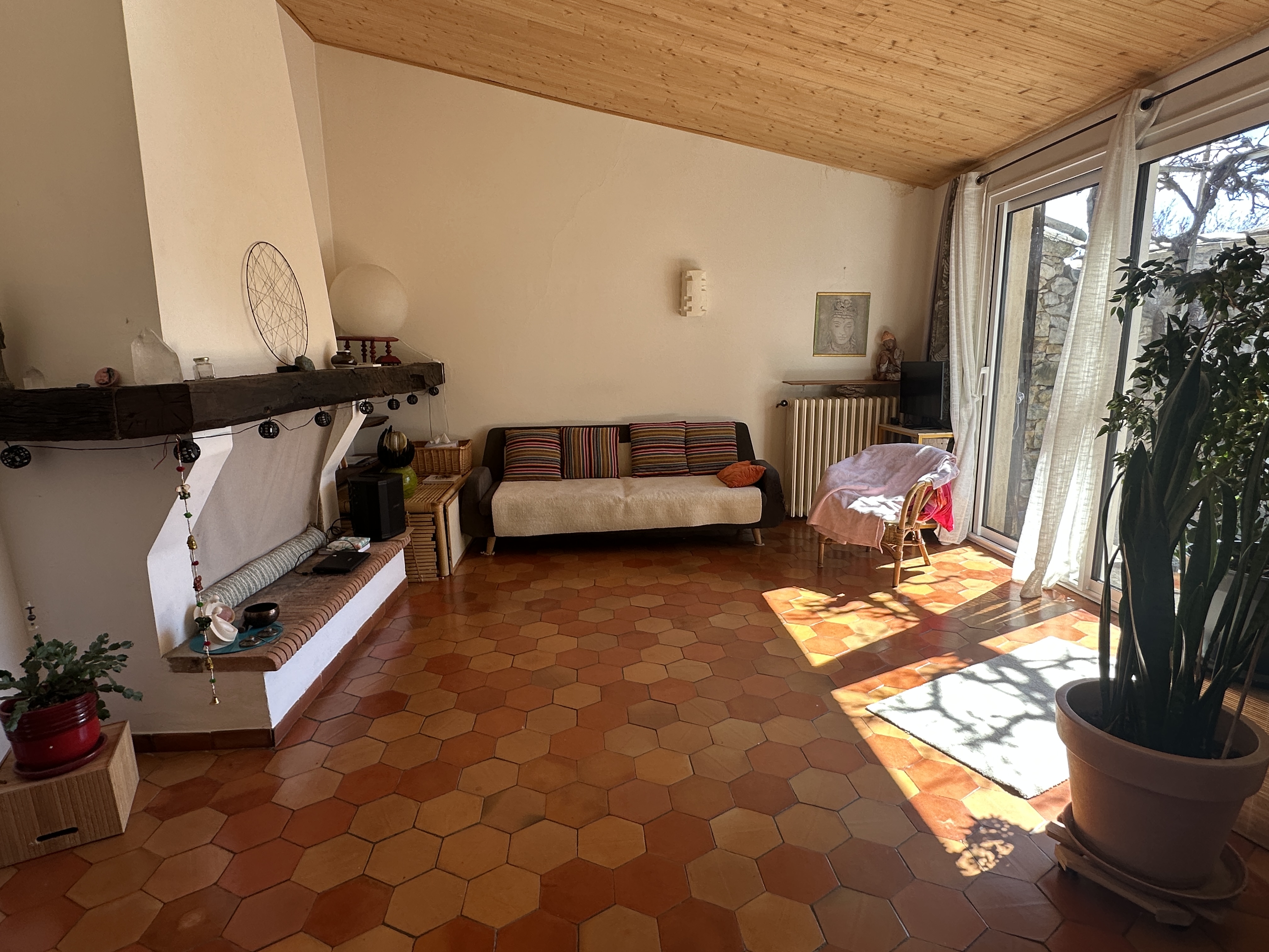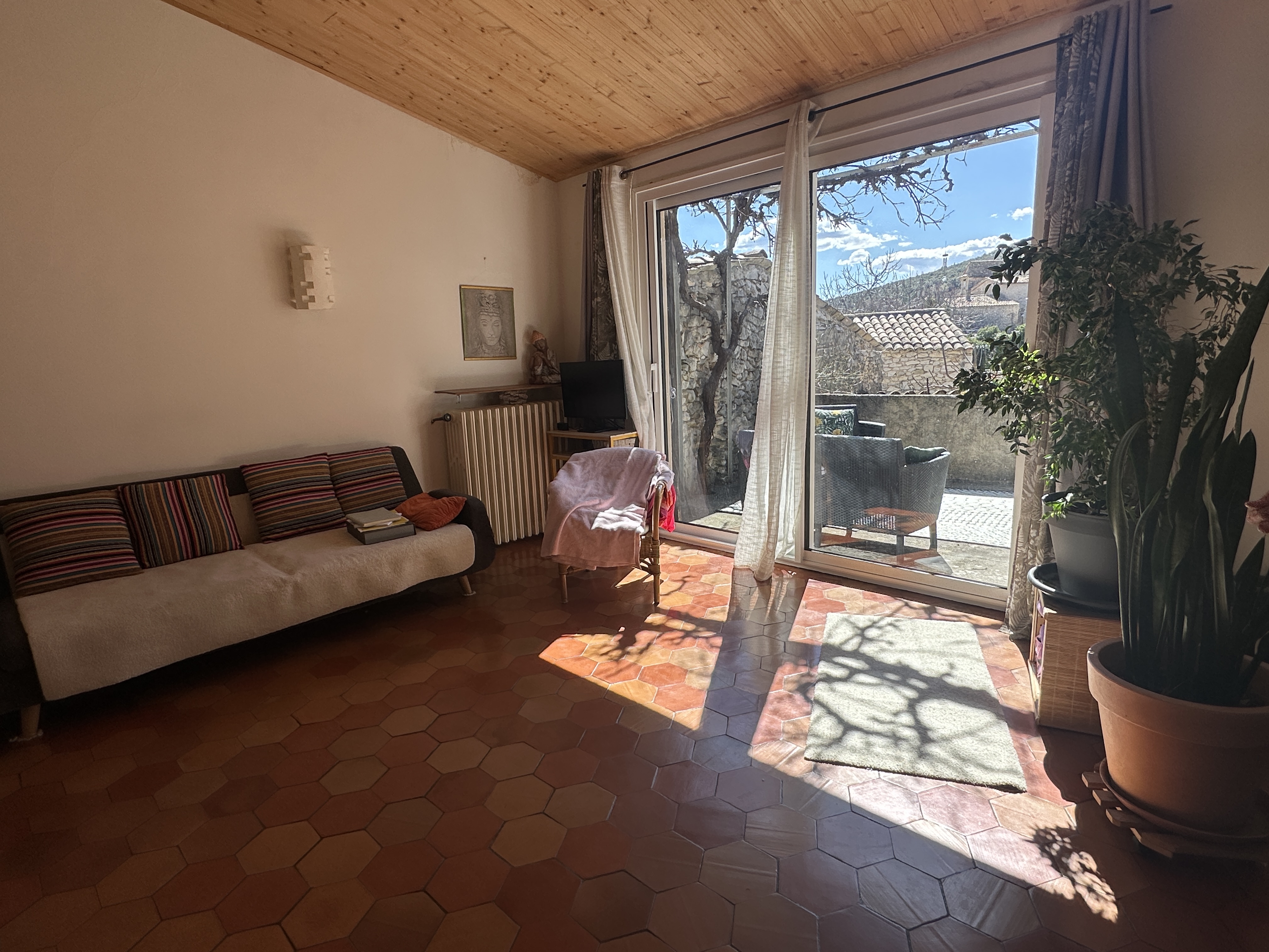 Dotée d’une terrasse plein sud et d’une cour fleurie et aménagée, cette maison de 138 m2 offre un cadre bucolique et tranquille avec ses deux chambres, son salon avec cheminée, une salle de séjour avec coin cuisine à aménager, une salle de bain et des WC séparés, ainsi qu’un figuier et une vigne donnant du raisin en abondance.